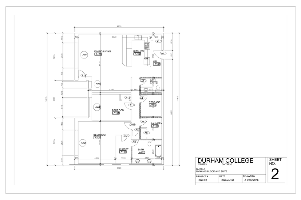 Completed through AutoCAD, this is a floorplan assumed to be mirrored for each floor containing two suite plans and a common area.